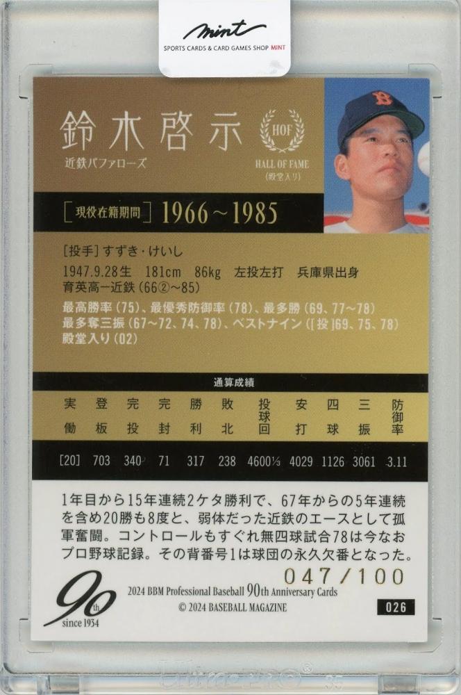 2024 BBM プロ野球90周年 鈴木啓示 金箔サイン版 100枚限定【047/100】近鉄バファローズ