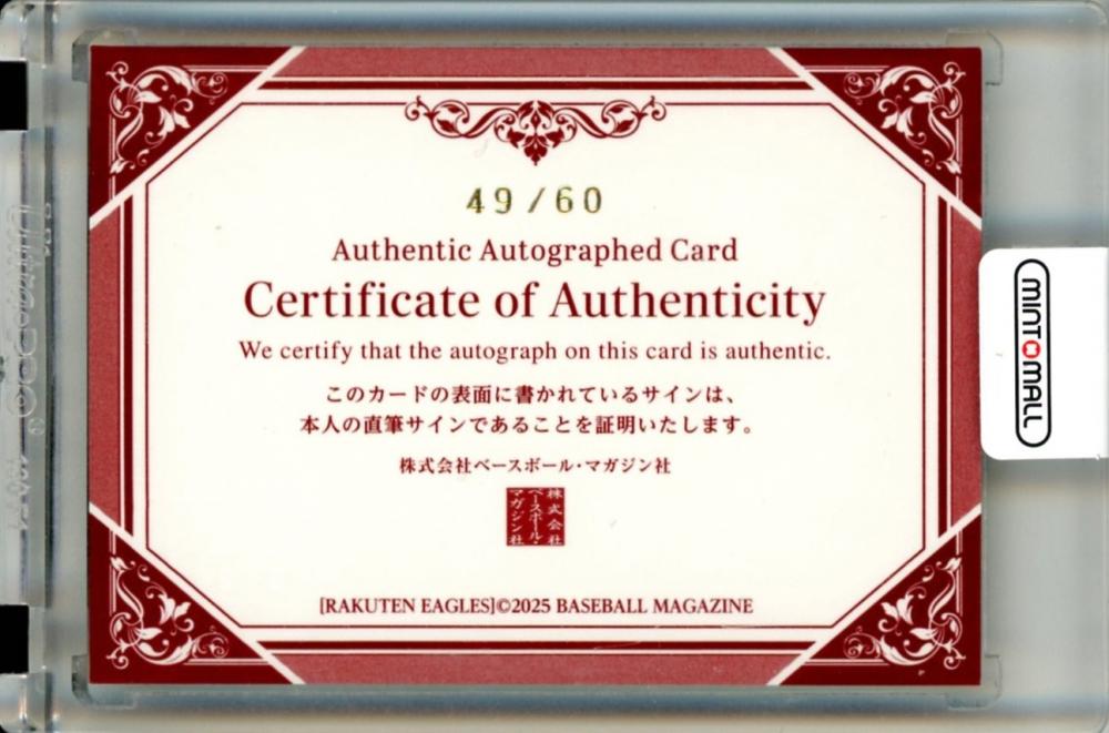 2025 BBM 東北楽天ゴールデンイーグルス 津留﨑大成 直筆サインカード【49/60】