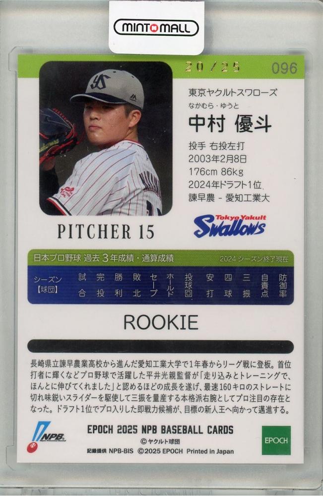 2025 EPOCH NPB 中村優斗 #096 ルーキー【20/25】 東京ヤクルトスワローズ