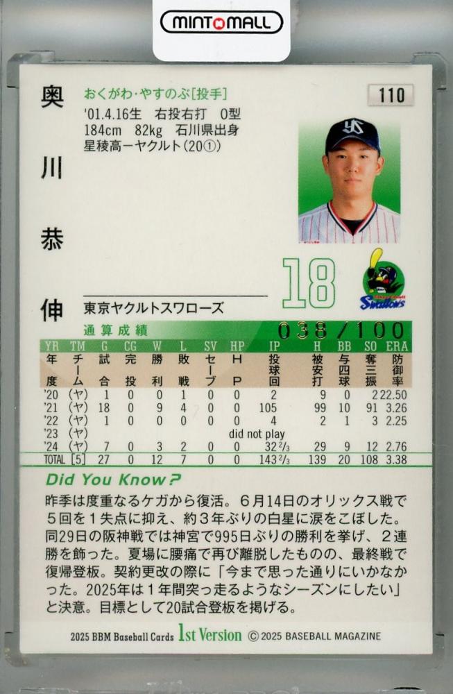 2025 BBM 1stバージョン 奥川恭伸 金箔サイン版【038/100】 東京ヤクルトスワローズ