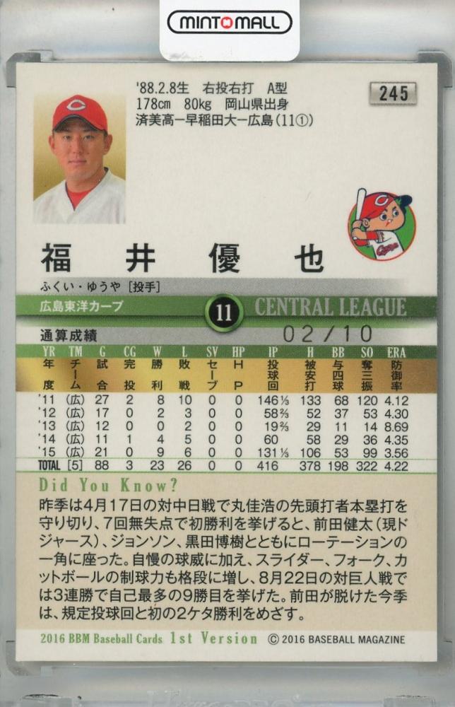 2016 BBM 1stバージョン 福井優也 緑箔サイン版【02/10】 広島東洋カープ