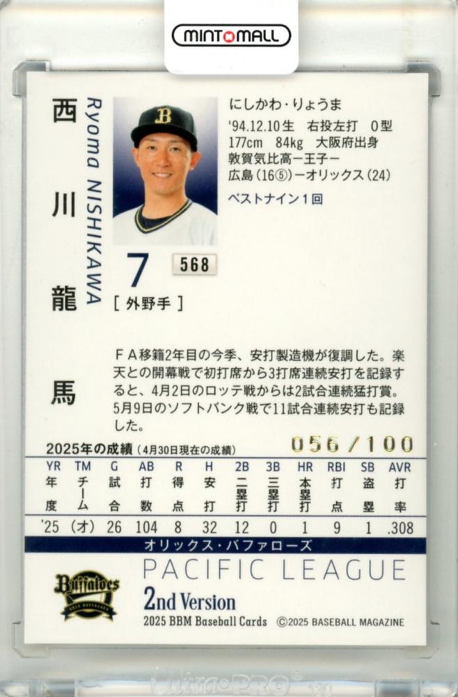 2025 BBM ベースボールカード 2NDバージョン 西川龍馬 #568 金箔サインカード【056/100】 オリックス