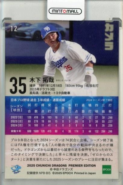 2025 EPOCH 中日ドラゴンズ PREMIER EDITION 木下 拓哉 AUTHENTIC AUTOGRAPH 直筆サインカード ゴールド版【09/39】