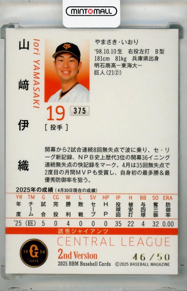 2025 BBM 2ndバージョン 山﨑伊織 ホロ箔サイン版【46/50】 読売ジャイアンツ