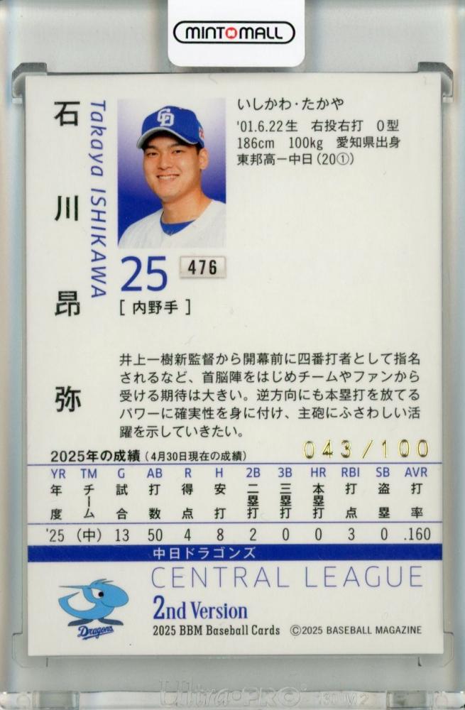 2025 BBM 2ndバージョン 石川昂弥 金箔サインカード【043/100】 中日ドラゴンズ