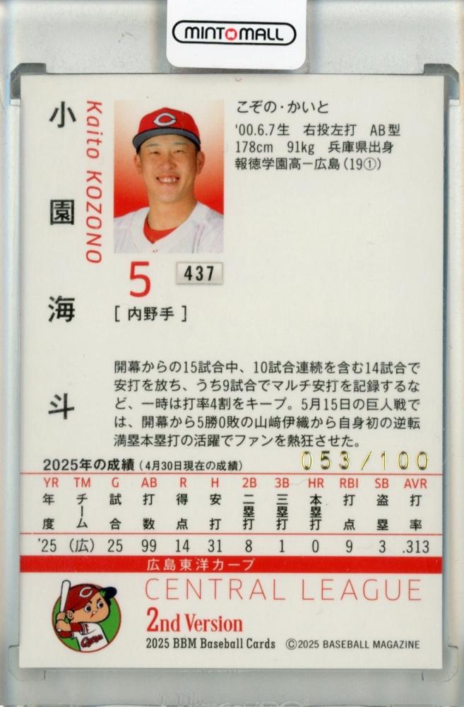 2025 BBM 2ndバージョン 小園海斗 金箔サインカード【053/100】 広島カープ