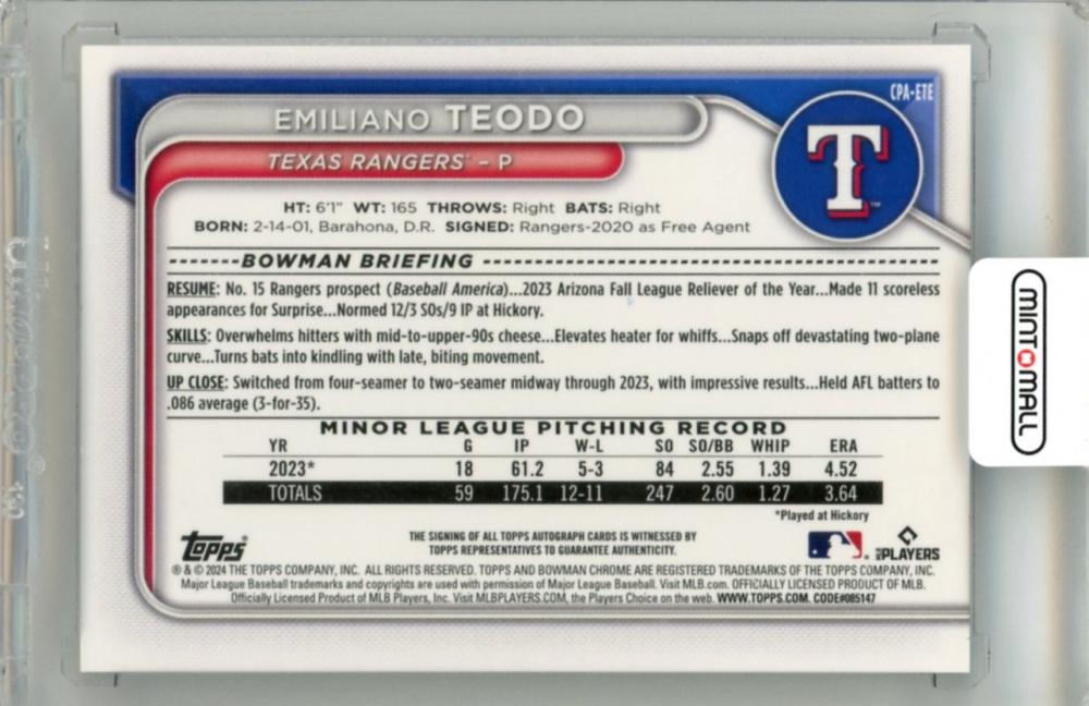 2024 Topps Bowman Chrome Emiliano Teodo #CPA-ETE Chrome Prospect Autographs Blue RayWave Refractor Parallel【009/150】 Rangers
