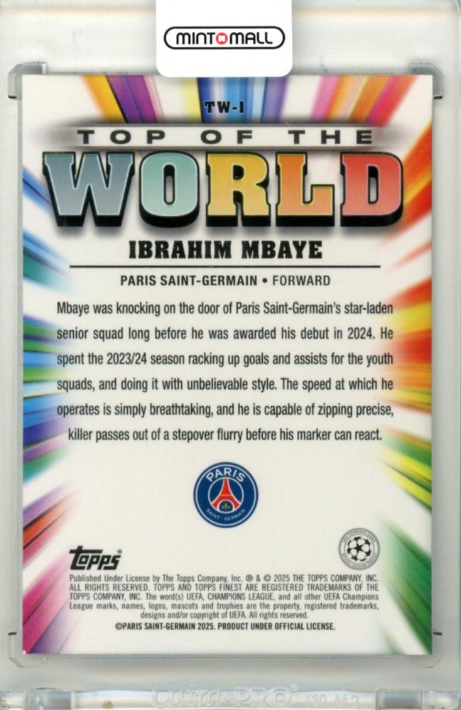 2024-25 Topps Finest Uefa Club Competitions Ibrahim Mbaye #TW-1 Top Of The World Purple Refractor Parallel【187/299】 Paris Saint-Germain