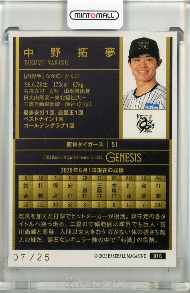 2025 BBM GENESIS 中野拓夢 ライトパープル箔版【07/25】 阪神タイガース