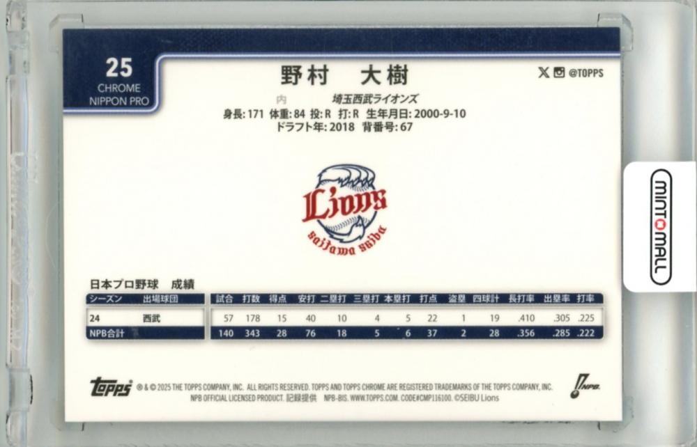 2025 TOPPS CHROME NPB 野村大樹 #25 Base Green Refractor Parallel【05/99】 西武