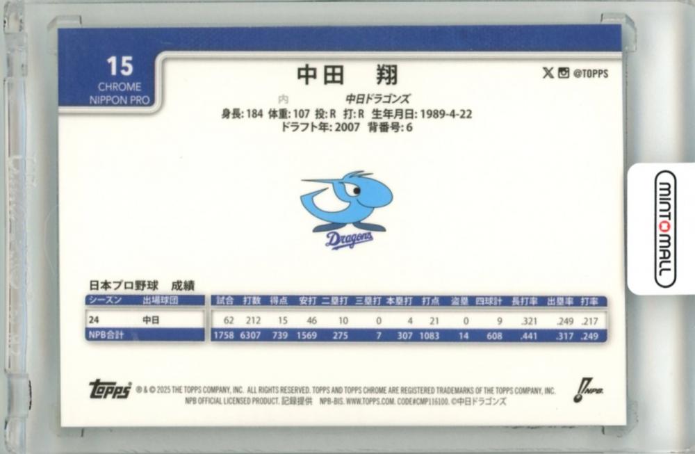 2025 TOPPS CHROME NPB 中田翔 #15 Base Aqua Refractor Parallel【013/199】 中日
