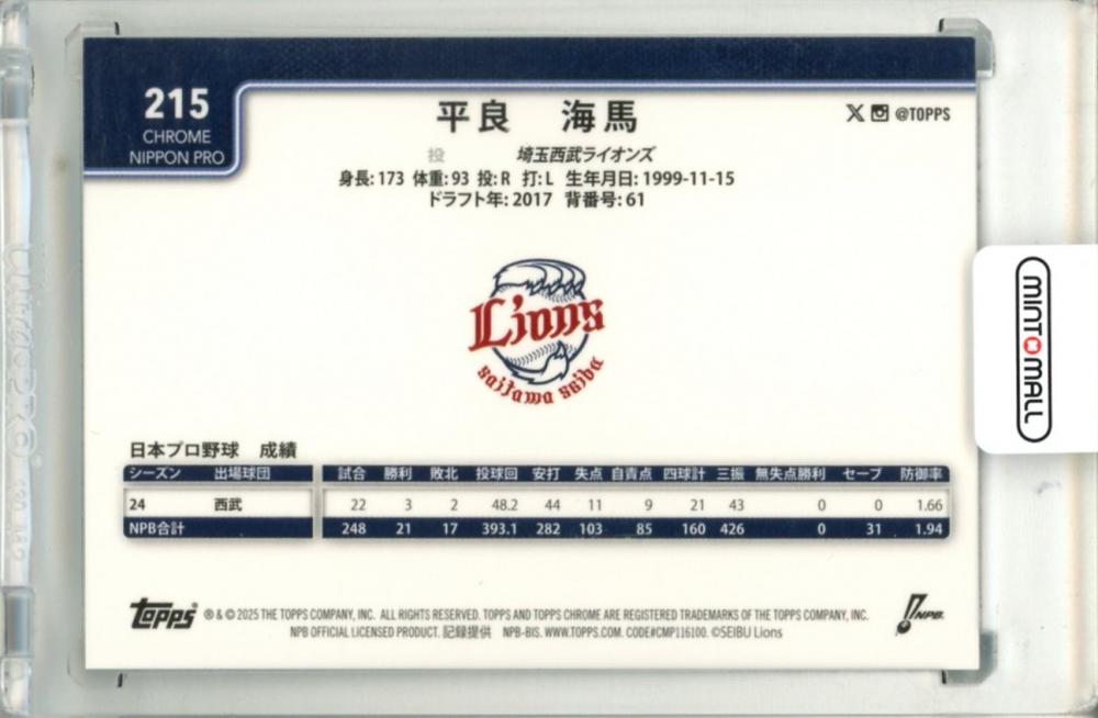 2025 TOPPS CHROME NPB 平良海馬 #215 Base Aqua Refractor Parallel【079/199】 西武