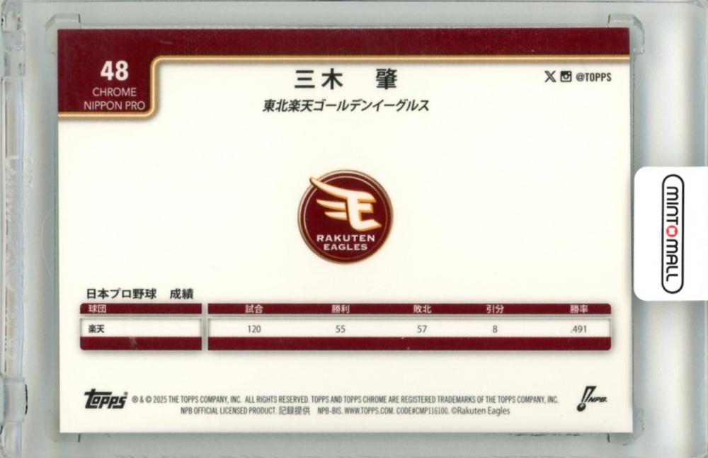 2025 TOPPS CHROME NPB 三木肇 #48 Base Aqua Refractor Parallel【187/199】 楽天