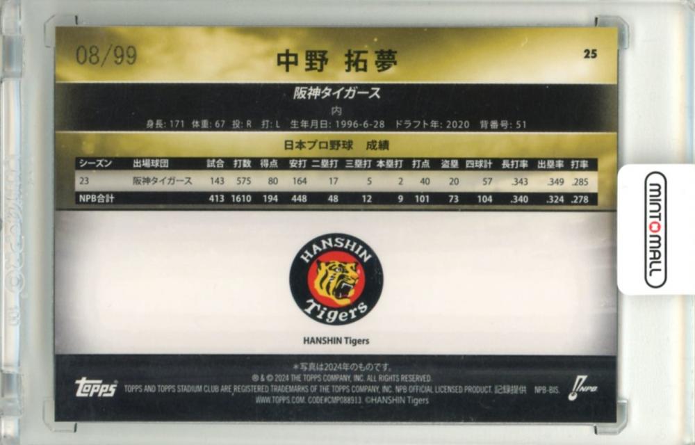 2024 TOPPS NPB STADIUM CLUB 中野拓夢 #25 Base Green Parallel【08/99】 阪神