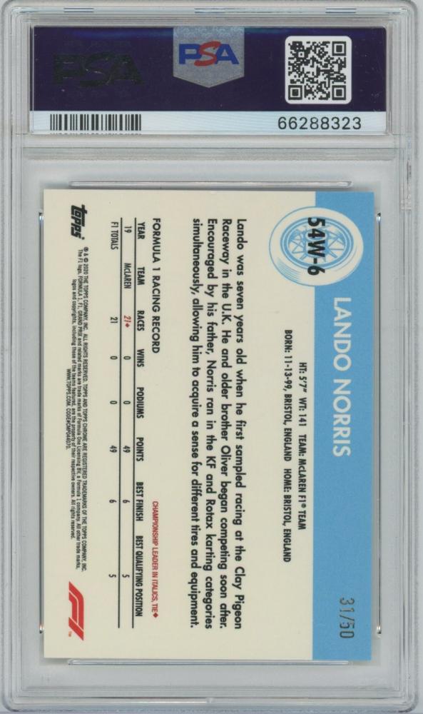 2020 TOPPS Chrome Formula 1 '54 Topps World on Wheels Gold Refractors / LANDO NORRIS(McLaren F1 Team) 【31/50】 [PSA9/ MINT]