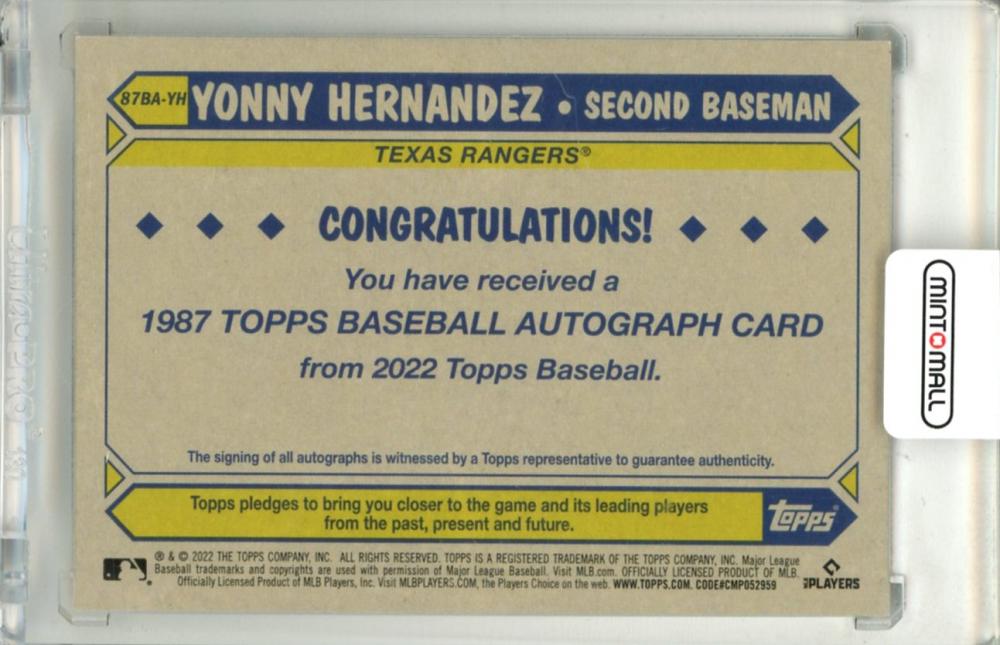 2022 Topps Baseball Yonny Hernandes #87BA-YH 1987 Topps Baseball Autograph Card Rangers