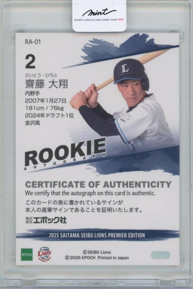2025 EPOCH 埼玉西武ライオンズ PREMIER EDITION / 齋藤大翔 ROOKIE AUTOGRAPH直筆サインカード 【18/20】