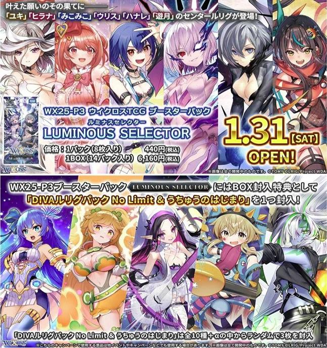 拡張パック「WX25-P3 LUMINOUS SELECTOR」の「BOX封入特典」「DIVAルリグパック No Limit & うちゅうのはじまり」は、全10種+αの中からランダムで3枚を封入!