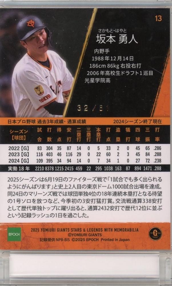 2025 読売ジャイアンツ STARS&LEGENDS 坂本勇人 #13【32/61】 読売ジャイアンツ
