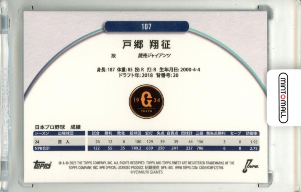 2025 TOPPS NPB FINEST 戸郷翔征 #107 Base Blue Refractor Parallel【128/150】 巨人