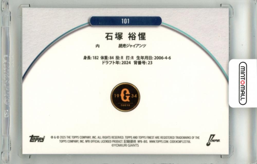 2025 TOPPS NPB FINEST 石塚裕惺 #101 Base Aqua Refractor Parallel【164/199】 巨人