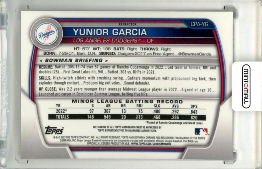 2023 Topps Bowman Yunior Garcia #CPA-YG Chrome Prospect Autograph Refractor Parallel【184/499】 Dodgers