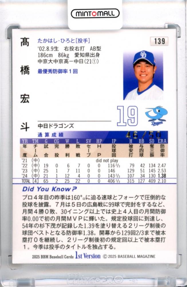 2025 BBM ベースボールカード 1STバージョン 髙橋宏斗 #139 ホロ箔サインカード【46/50】 中日