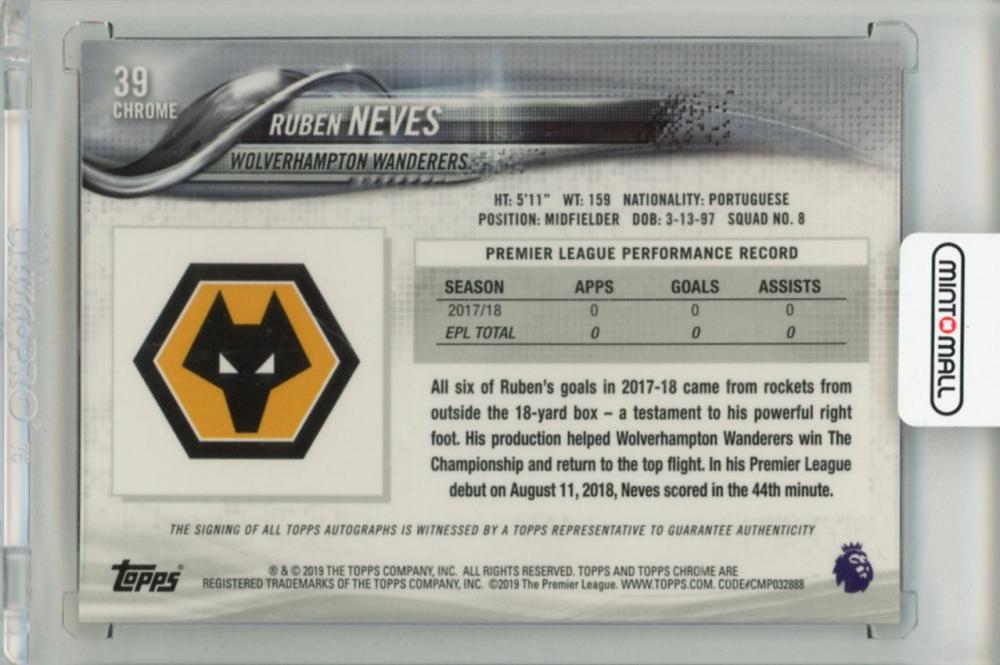 2018-19 TOPPS Chrome English Premier League Ruben Neves Autographs Refractors #39 Wolverhampton Wanderers