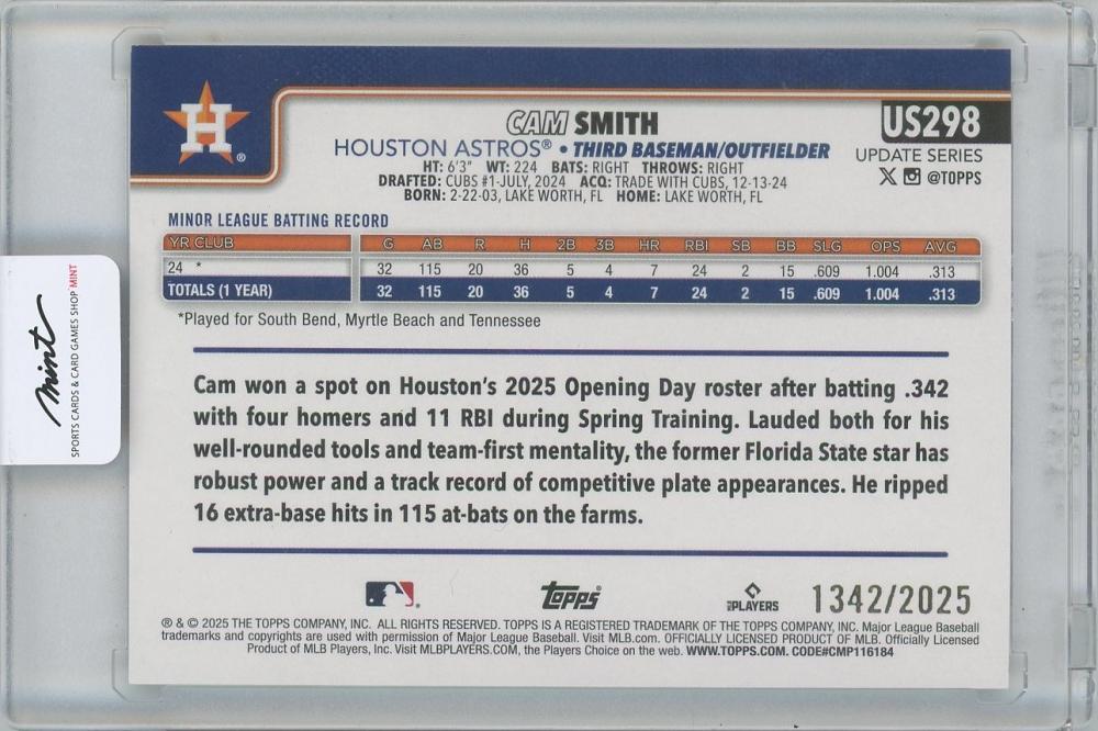 2025 TOPPS Update Gold #US298 / CAM SMITH(Houston Astros) 【1342/2025】