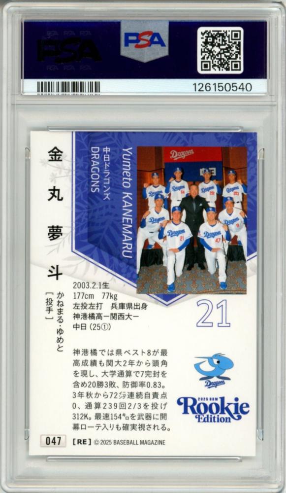 2025 BBM ルーキーエディション 金丸夢斗 #047 レギュラーカード【PSA10】 中日
