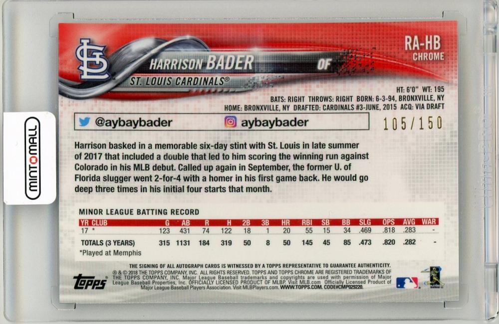 2018 Topps Chrome Harrison Bader Rookie Autographs St. Louis Cardinals