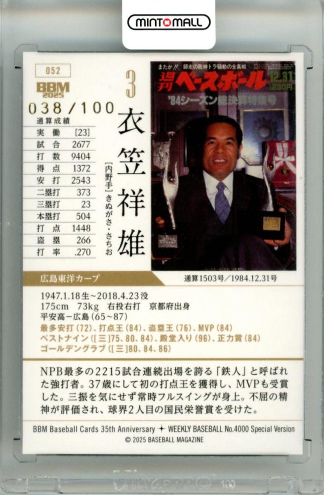 2025 BBM BBMカード35周年&週刊ベースボール4000号記念 スペシャルバージョン 衣笠祥雄 #052 レギュラーカード 金箔サイン版【038/100】 広島