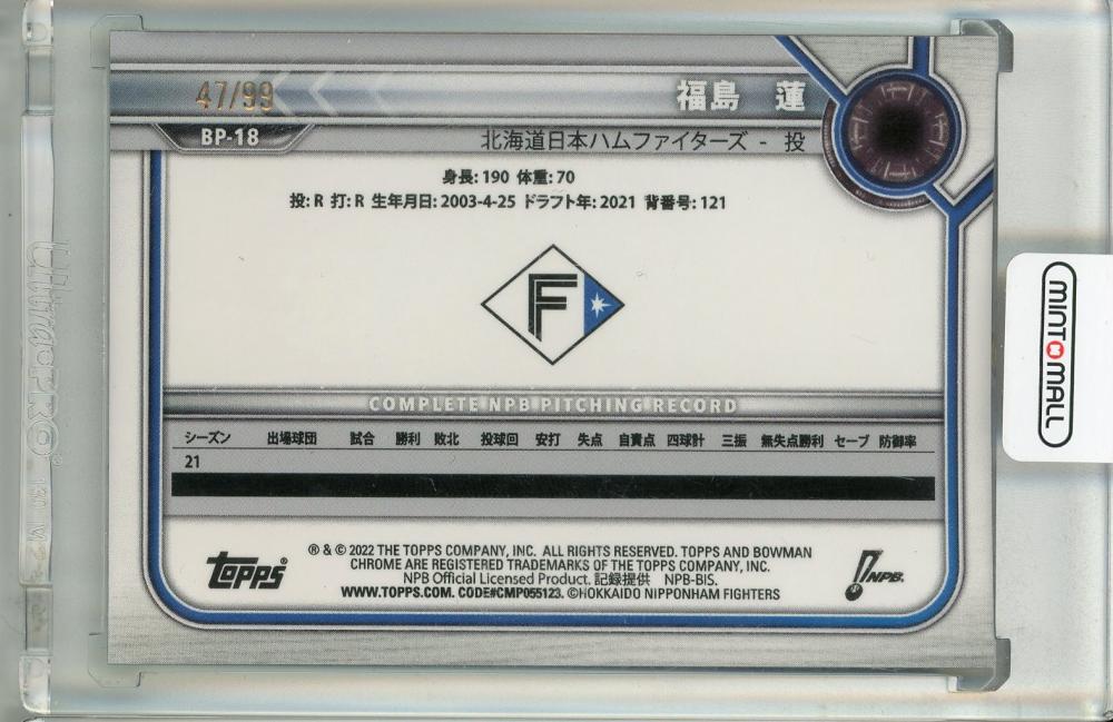 2022 Bowman Chrome NPB 福島蓮 グリーンパラレル【47/99】 北海道日本ハムファイターズ