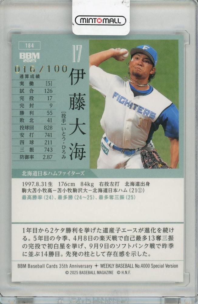 2025 BBM 35周年 伊藤大海 #184 箔サイン【016/100】 北海道日本ハムファイターズ