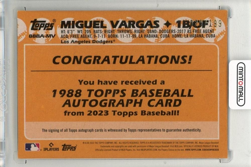 2023 TOPPS Miguel Vargas 1988 Topps Autographs Black #88BAMV【029/199】 Los Angeles Dodgers