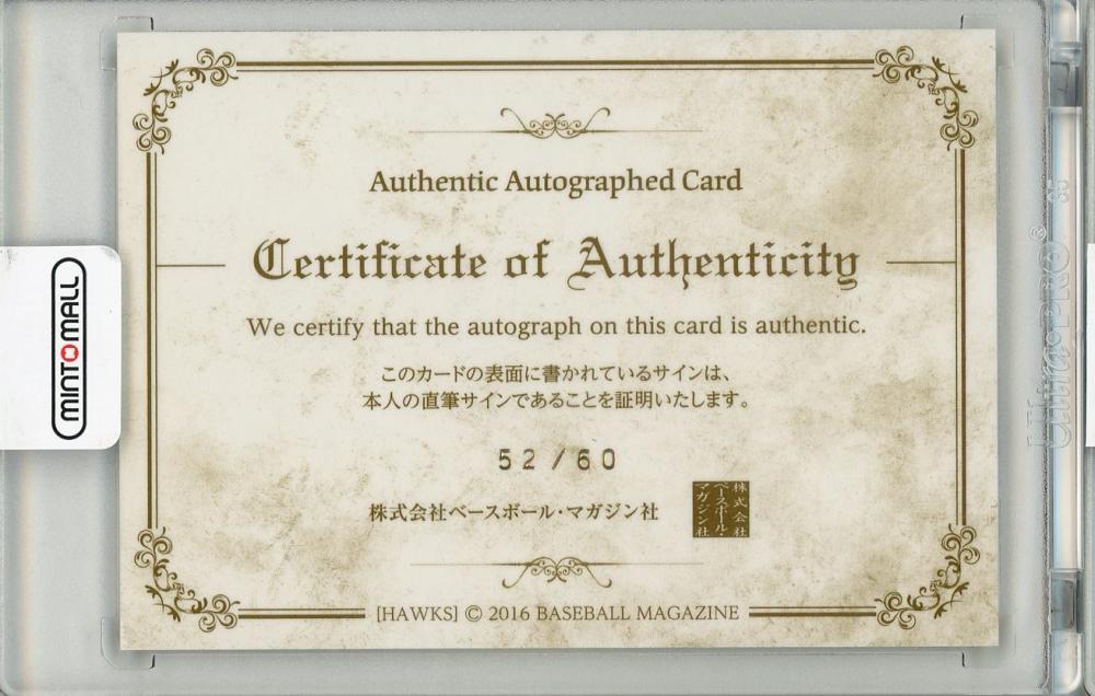 2016 BBM 福岡ソフトバンクホークス 真砂勇介 直筆サイン【52/60】 福岡ソフトバンクホークス