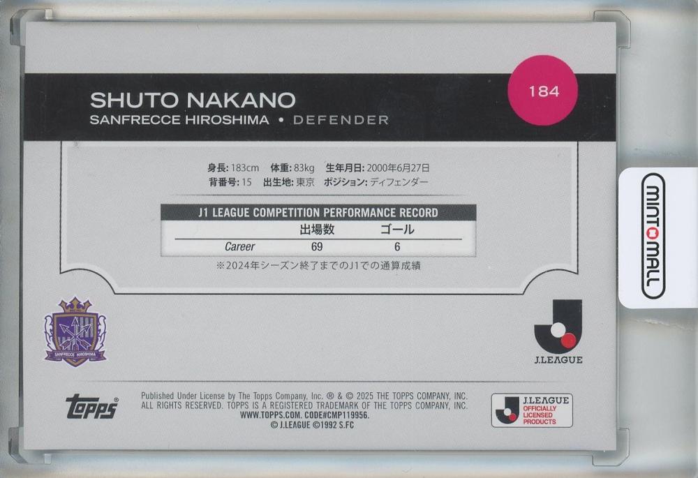 2025 TOPPS J. LEAGUE PREMIUM 中野就斗 BASE CARD SHORT PRINTS: JAPANESE BORDER VARIATIONS #184 サンフレッチェ広島