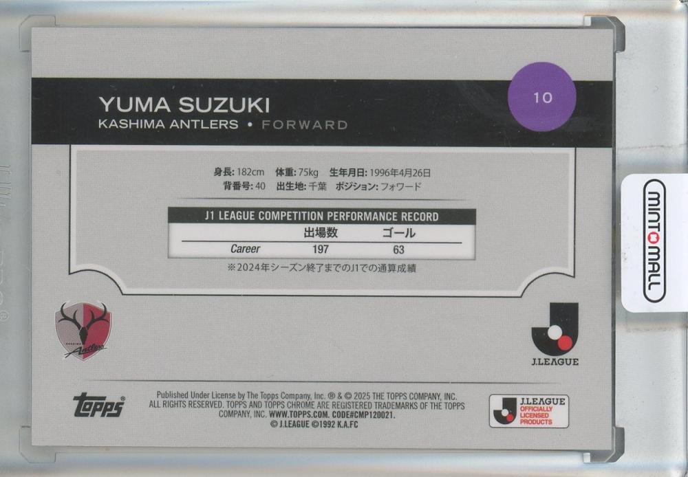 2025 TOPPS J. LEAGUE PREMIUM 鈴木優磨 BASE CARD SHORT PRINTS: JAPANESE BORDER VARIATIONS #10 鹿島アントラーズ