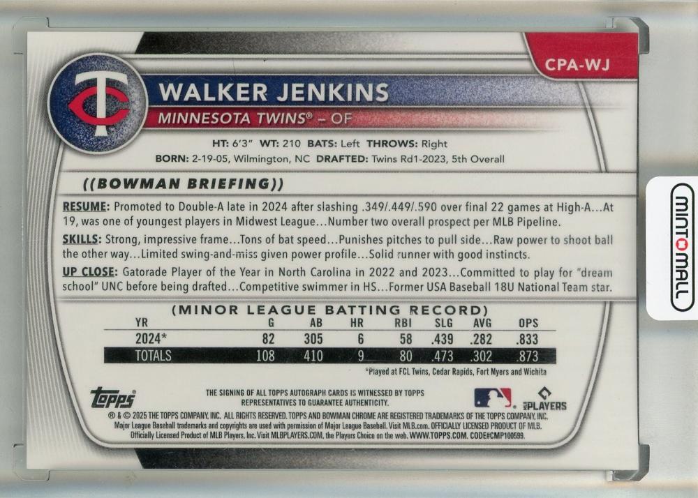 2025 Bowman Chrome Walker Jenkins Prospect Autographs #CPAWJ Minnesota Twins