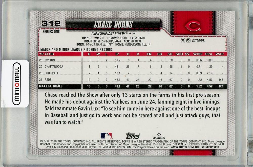 2025 TOPPS Series 1 Chase Burns RC#312 Cincinnati Reds