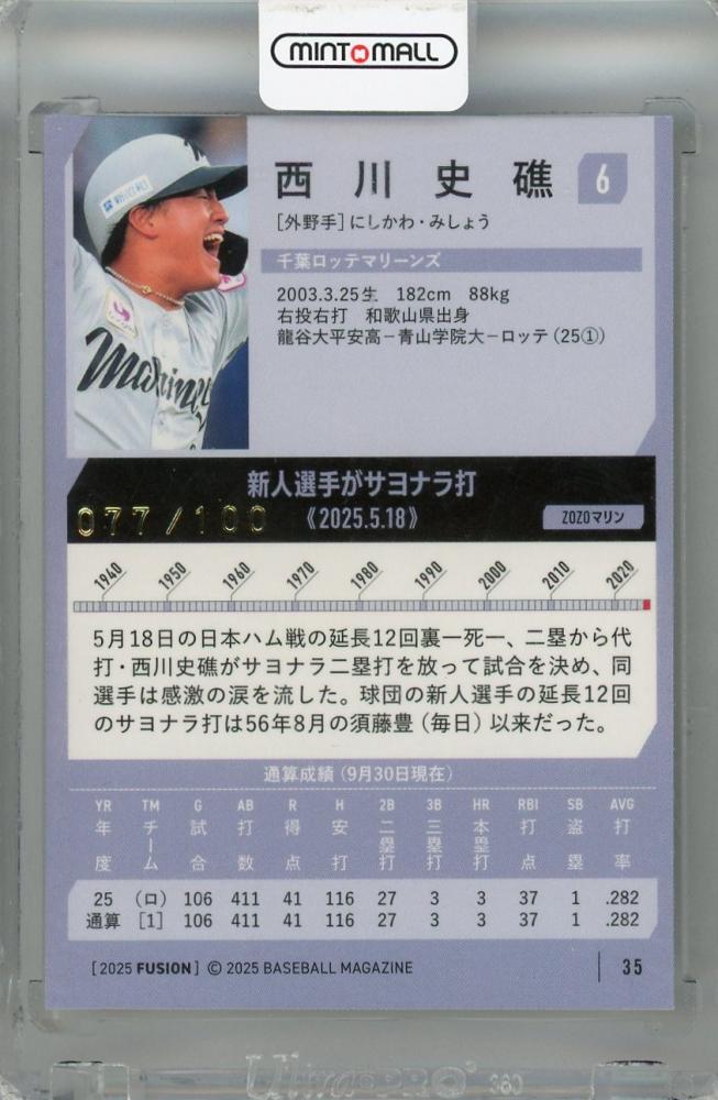 2025 BBM FUSION 西川史礁 記録の殿堂 金箔サインカード【077/100】 千葉ロッテマリーンズ