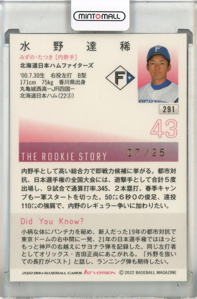 2022 BBM 1st Version 水野達稀 ルーキーパラレル銀紙 ホロ箔版【07/25】 北海道日本ハムファイターズ