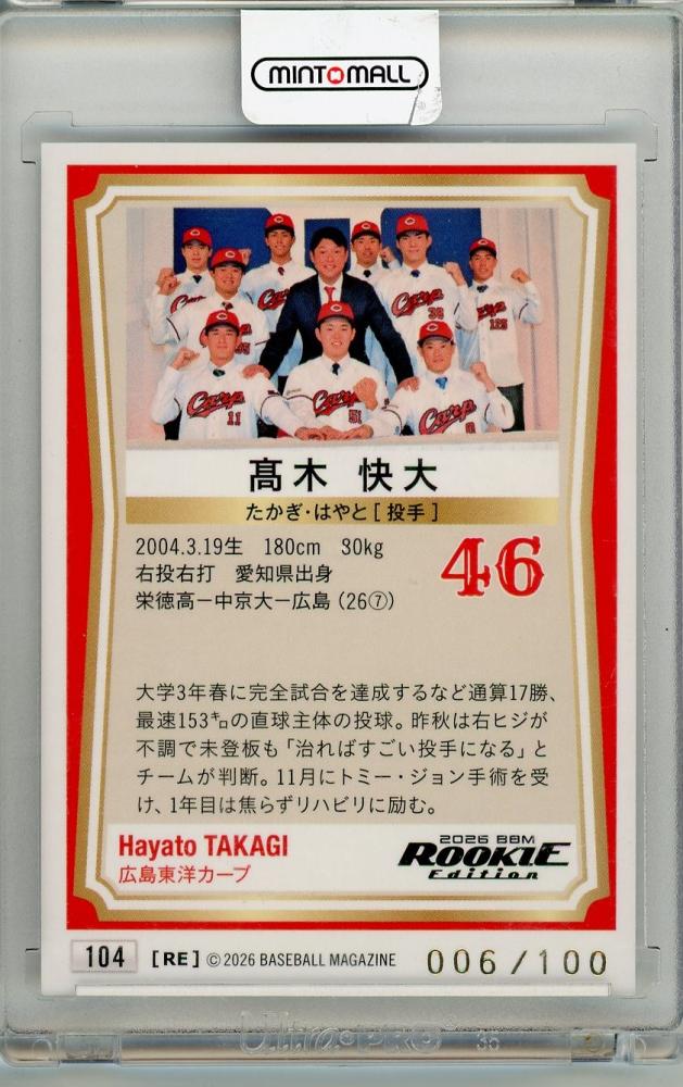 2026 BBM ルーキーエディション 髙木快大 #104 金箔サインカード【021/100】 広島