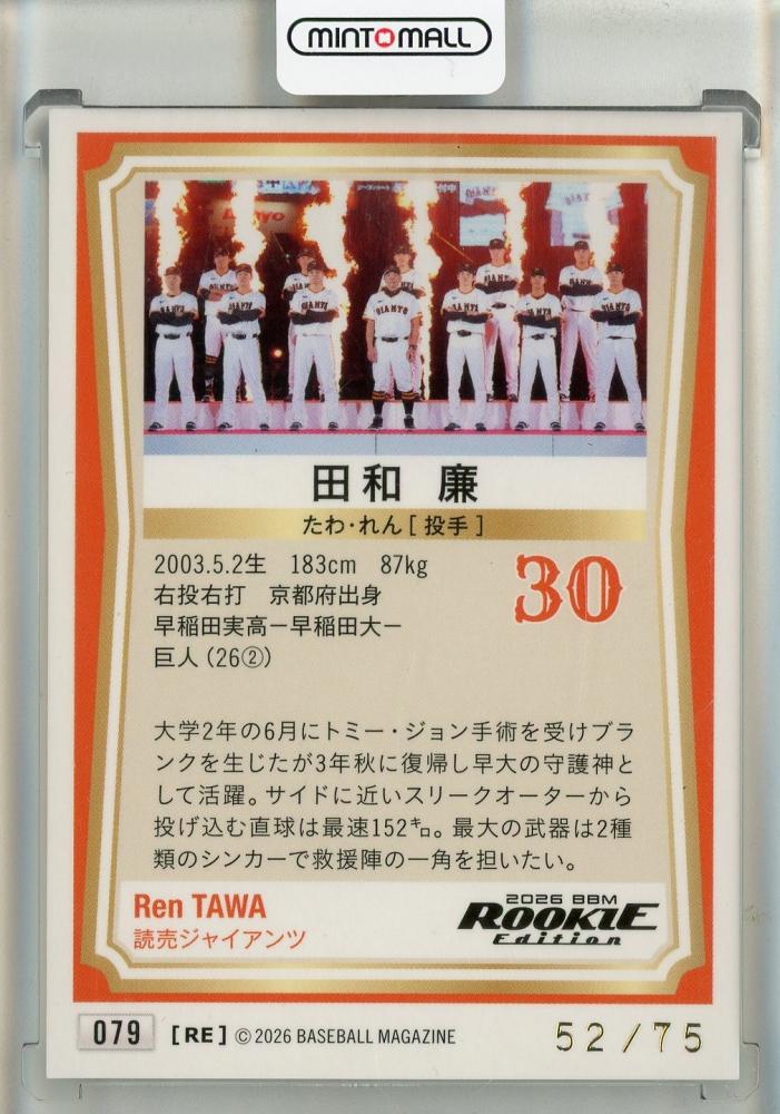 2026 BBM Rookie Edition 田和廉 緑箔サイン【52/75】 読売ジャイアンツ