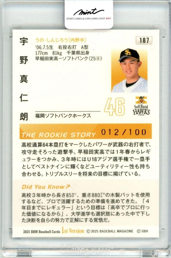 2025 BBM 1st バージョン 宇野真仁朗 RC ルーキーパラレル 金箔版 100枚限定【012/100】福岡ソフトバンクホークス