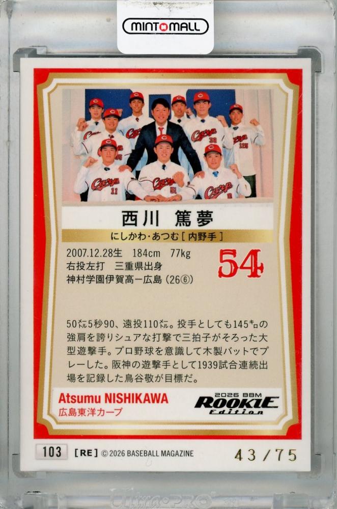 2026 BBM ルーキーエディション 西川篤夢 緑箔サインカード【43/75】 広島東洋カープ