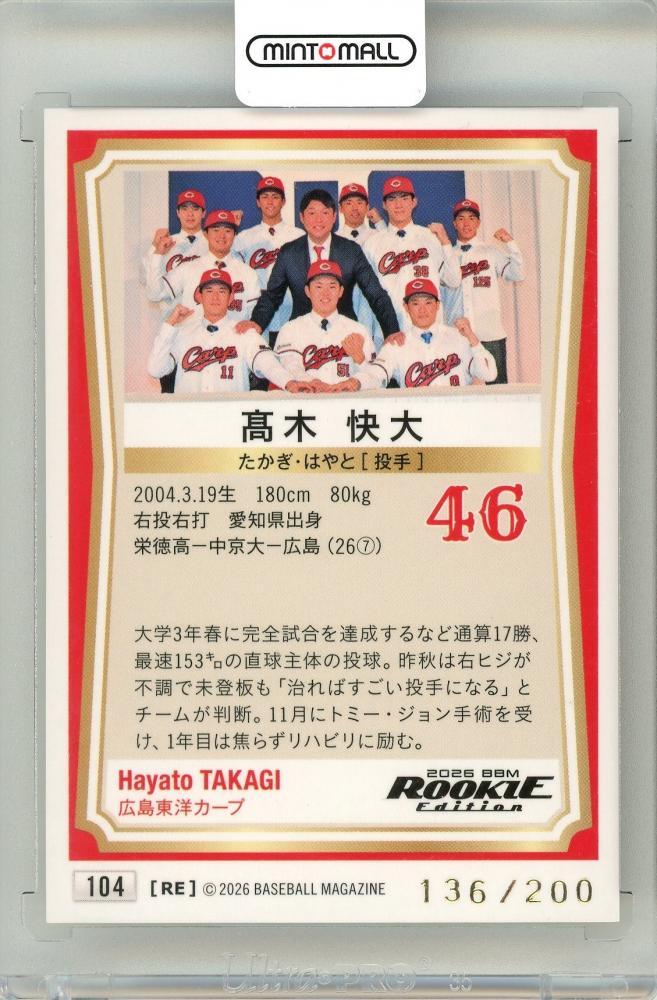 2026 BBM ルーキーエディション 髙木快大 #104 銀箔サインカード【136/200】 広島