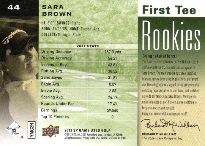 2012 UPPER DECK SP Game Used Golf Sara Brown Autograph & Event Used Shirt 174/399