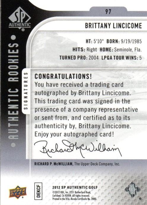 2012 UPPER DECK SP Authentic Golf Brittany Lincicome Autograph 210/699