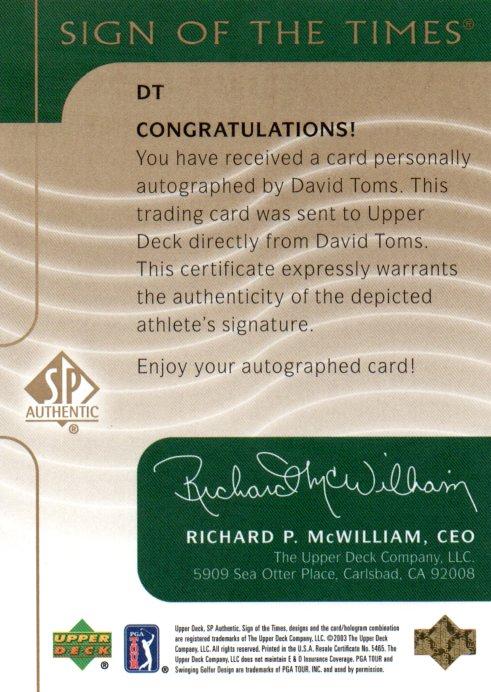 2003 UPPER DECK SP Authentic David Toms Autograph